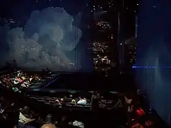 The LOVE theatre features 32 digital projectors that are used in the show. Everything is digital from source to screen, making very large high definition digital 100’ wide panoramic images. Video images on two walls above the audience on two sides of the auditorium emphasize elements of the show and provide transitions. High-definition projectors also create enormous images (designed by Francis Laporte) on four translucent screens that can be unfurled to divide the auditorium.