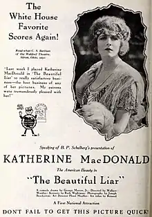 The Beautiful Liar is a 1921 American comedy film directed by Wallace Worsley and written by Ruth Wightman. The film stars Katherine MacDonald, Charles Meredith, Joseph J. Dowling, Kate Lester, and Wilfred Lucas. The film was released on December 26, 1921, by Associated First National Pictures.[1][2][3]