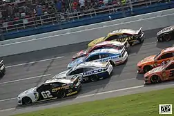 - Lap 122: During a NASCAR overtime, on the back straightaway of one of the five overtimes that occurred during the race, Aric Almirola was turned into the outside wall by second-place Kyle Larson, triggering a massive 18 car melee that collected big names, including Justin Allgaier, Joey Logano, and Brandon Jones. The race was eventually had a photo finish in the fifth overtime, between Elliott Sadler and Tyler Reddick.[47]