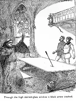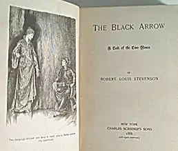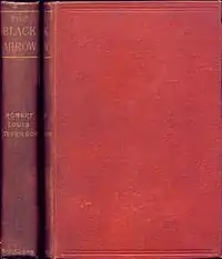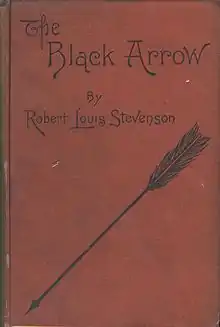 The Black Arrow: A Tale of the Two Roses is an 1888 novel by Robert Louis Stevenson. It is both a historical adventure novel and a romance novel. It first appeared as a serial in 1883 with the subtitle "A Tale of Tunstall Forest" beginning in Young Folks; A Boys' and Girls' Paper of Instructive and Entertaining Literature, vol. XXII, no. 656 (Saturday, 30 June 1883)[1] and ending in vol. XXIII, no. 672 (Saturday, 20 October 1883)[2]—Stevenson had finished writing it by the end of summer.[3] It was printed under the pseudonym Captain George North.[1] He alludes to the time gap between the serialisation and the publication as one volume in 1888 in his preface "Critic [parodying Dickens's 'Cricket'] on the Hearth": "The tale was written years ago for a particular audience..."[4] The Paston Letters were Stevenson's main literary source for The Black Arrow.[5] The Black Arrow consists of 79,926 words.