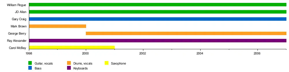 In the spring of 2000, Mark Brown left the band to join the Cosmic Rough Riders.[1] Shortly after, George Berry, a former bandmate of Craig, was brought in to replace Brown on drums.