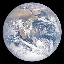 Apollo 17 was the last crewed lunar mission. No human since has been far enough from Earth to photograph a whole-Earth image[2] such as The Blue Marble, but whole-Earth images have been taken by many uncrewed spacecraft missions.[29]