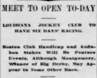 Members of the Boston Club frequently patronized Jockey Clubs of the area, the Eclipse Race Course, the Metairie Race Course and the Fair Grounds Race Course, putting up high stakes purses to help offset the Jockey Club's expenses. "The Boston Club...being composed of gentlemen who know ‘what's what’...insured a numerous and distinguished attendance upon these occasions."[63] Later noting "In the betting circles last evening... The wagering was spirited and lively, and a good deal of money will change hands as a result."[64] Boston Club Founder John Randolph Grymes owned filly Susan Yandal who ran in the first races, his cousin Henry Tayloe, younger son of turfman J. Tayloe III of The Octagon, was one of the founders of The Louisiana Jockey Club, along with native French Creole Bernard de Marigny.