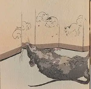 The boy does not want to return to his father's farm for fear of punishment, and instead, he travels to the temple in the neighboring village, twelve miles away, hoping to be admitted as an acolyte there, not realizing all the priests living there have long-ago been driven away by a giant goblin-rat, and a number of warriors have gone missing after attempting to eradicate the goblin at night. The boy enters the deserted temple, which is dusty and cobwebbed. But he finds many big white screens to draw on, and finding a writing box (containing a brush), he ground some ink (i.e., ground inkstick on an inkstone), and draws cats on them.[6]