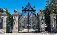 The Ochre Point Avenue entrance is marked by sculpted iron gates, and the 30-foot-high (9.1 m) walkway gates are part of a 12-foot-high (3.7 m) limestone-and-iron fence that borders the property on all but the ocean side. The footprint of the house covers approximately 1 acre (4,000 m2) or 43,000 square feet of the 14 acres (5.7 ha) estate on the cliffs overlooking Easton Bay of the Atlantic Ocean.[3]