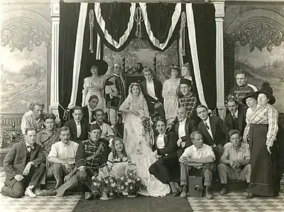 Production still of the cast and crew of The Broken Coin with Cunard and Francis Ford together (rear center) on throne. A cameraman, likely Harry McGuire Stanley, is sitting (front right) with a Pathé film camera between his feet.