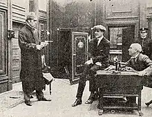 Former World Heavyweight boxing champion "Gentleman Jim" Corbett played Raffles. The character's nationality was changed from English to American to match Corbett's casting.[1][2] The play was produced by Corbett's touring company. Sherlock Holmes was initially played by Arthur V. Johnson. The play toured the country for several years and several other actors played Holmes.[2]