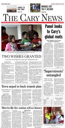 The Cary News was published twice weekly and freely distributed by the News and Observer free to residents of Cary, North Carolina and Morrisville, North Carolina.