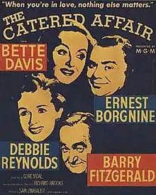 The Catered Affair (also known as Wedding Party) is a 1956 American comedy drama film directed by Richard Brooks and produced by Sam Zimbalist from a screenplay by Gore Vidal, based on a 1955 television play by Paddy Chayefsky. The film stars Bette Davis, Ernest Borgnine, Debbie Reynolds, Barry Fitzgerald and Rod Taylor. It was Taylor's first film for Metro-Goldwyn-Mayer after signing a long-term contract with the studio.[2] The film score was by André Previn and the cinematographer was John Alton.