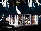 Other stage elements include a giant disco ball, a giant cube and a spinning carousel-like glass-window with large crucifixes depicting a chapel.[40][41][42][37] For the cube design, Madonna collaborated with game designer and artist Gabriel Massan inspired by her video "Bedtime Story" and Massan's dreamy landscapes. The cube is raised and projectors cover each side of the cube, with her movements recorded in real time.[43] Described as a "city of portraits",[36] the show have also several hanging retractable screens, and used the most amount of video in her touring career.[38][25] Speaking about the screens that came out constantly with projections on, according to Lipson, it allows singer's image and "key motifs" of her career to be "displayed to the entire crowd throughout the show".[35]