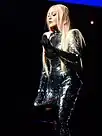The tour also included designs and clothing of various brands, including Dilara Fındıkoğlu and Miu Miu, as well a catsuit by Donatella Versace and Jean Paul Gaultier whom created a modern new version of her cone bra made famous during the Blond Ambition World Tour in 1990, a black cone mini dress encrusted with black crystals.[55][57][56][58][41] She also wore a halo-style headpiece by House of Malakai with a kimono by Eyob Yohannes.[56] Having 45 wardrobe trunks,[32] tour's wardrobe included hats and 45 pairs of boxing gloves.[32]