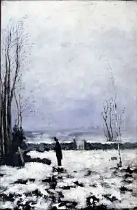 In the late fall of 1877 Hill suffered from a tense situation where he hovered between arrogance and deepest despair, and he suffered increasingly from schizophrenia.[2] The contact with the outside world, with his comrades, became less and less. His studio door in Paris was shut. In his Christmas letters to his family in Sweden from 1877 Hill recounts the motifs that had occupied him, as well as those he wanted to paint in the future, including a cemetery with a man standing in front of a cross adorned with a wreath. Critic Reidar Ekner describes the figure as "extremely alone, isolated in the universe."[2]