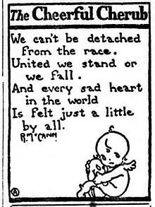 The Cheerful Cherub is an American single-panel newspaper comic written and drawn by Rebecca McCann, originally published in the Chicago Evening Post and syndicated by George Matthew Adams.[1] Every installation features the title character, accompanied by his pet dog, speaking a short poem, generally in an iambic meter, offering wisdom, wit, observation, or insight on sundry topics, such as ambition,[2] education,[3] friendship,[4] lies,[5] sin,[6] and work.[7]
