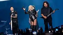 The "imposing" stage set prompted media comparisons to a nightclub or S&M club in Germany.[20][21] For The Telegraph's Neil McCormick, the black and white brutalist architecture invoked a "nightmarish Soviet dystopia as imagined by Fritz Lang", an opinion shared by Billboard's Joe Lynch, who found shades of Lang's 1927 expressionist film, Metropolis in the design.[22] McCormick felt that "this initially bleak aesthetic" provided a striking contrast to the colorful costume changes and special effects.[2] The main stage was accompanied by two catwalks, and five five-story high screens.[21] A secondary, smaller stage houses Gaga's piano. Bedecked in tree branches, the instrument received comparisons to H. R. Giger's work.[23][24][22] In addition to flamethrowers which provided pyrotechnic effects,[25] the audience received LED wristbands which were glowing in time with the beat and changed color for each song.[26]