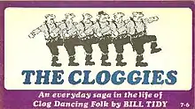 The Cloggies began as a single standalone cartoon published in the British satirical magazine Private Eye during 1967, which depicted a group in the midst of a morris dance as an army jeep tries to warn that they should remain still, as they were in a minefield. The cartoon was noticed by Private Eye co-founder Richard Ingrams, who believed that it could be expanded into a regular series.[2] Tidy agreed and the strip ran in the magazine until 1981. It was later picked up by the weekly magazine The Listener, where it was published from 1985 to 1986.[3]