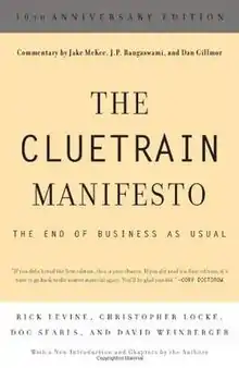 The Cluetrain Manifesto was written and first posted to the Web in March 1999[1][2] by Rick Levine, Christopher Locke, Doc Searls, and David Weinberger. A revised and extended version of the text appeared as a book under the title The Cluetrain Manifesto: The End of Business as Usual in 2000.[3]
