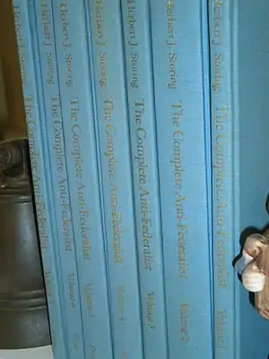The Complete Anti-Federalist is a 1981 seven-volume collection of the scattered Anti-Federalist Papers compiled by Herbert Storing and his former student Murray Dry of the University of Chicago, who oversaw the completion of the project after Storing's death. Michael Lienesch treats Storing's compilation as "definitive," and many of the pamphlets and other materials included had not previously been published in a collection.[1] The collection is noted for its sympathetic portrayal of the Anti-Federalists. The commentary underscores little-known similar positions and arguments made by the birth of the first two-party system in America. Storing points out that many "Anti-Federalists" actually considered themselves Federalists in the sense that a federation is a structure over sovereign states.