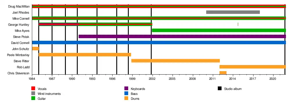 Guitarist Mike Connell formed the band in 1984 along with his brother David Connell on bass, Doug MacMillan on lead vocals,[1] and future filmmaker John Schultz on drums.[2] This initial four-person line-up was quickly supplemented by the addition of George Huntley on second guitar, keyboards, and vocals. Around the same time, former Johnny Quest drummer Peele Wimberley replaced Schultz, finalizing the "classic" line-up of the band.