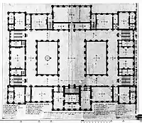 The painting was commissioned for the gallery of the new city hall on the Dam, finished in 1655 (now the Royal Palace). History paintings were regarded as the highest in the hierarchy of genres in the 17th century (a view Rembrandt shared), and the Batavian revolt was regarded, and romanticised, as a precursor of the recently ended war against the Spanish.[5] In 1659, when John Maurice of Nassau, Amalia of Solms-Braunfels, her two daughters and two daughters-in-law came to see the new building,[6] the council commissioned twelve paintings from Rembrandt's ex-pupil Govert Flinck to fill all the large spaces using a programme drawn up by the poet Joost van den Vondel, but Flink died in 1660 before completing any of the works.[7] The work was then shared out by the burgomasters Joan Huydecoper and Andries de Graeff, who were certainly decisive, between a number of painters including Jacob Jordaens and Jan Lievens. The council provided the canvas to the artist. Rembrandt was commissioned to do the scene from Tacitus, one of eight intended to cover the revolt in the original scheme.[8]