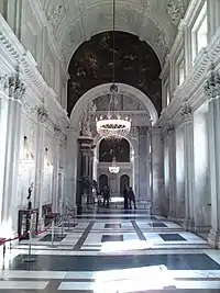 In August 1662, when the painting was still there, Rembrandt signed an agreement giving a "quarter-share of his profits accruing from the piece for the City Hall and his prospective earnings from it."[16] By 24 September 1662, however, when the archbishop and elector of Cologne Maximilian Henry of Bavaria was received in the town hall, Rembrandt's painting was gone.[17] One objection may well have been the incongruous crown that Rembrandt had set upon Claudius Civilis's head and his dominating the scene, hardly features of a consultative, republican attitude.[18] Blankert suggested that the painting had too much dark, unused space, compared with the others who had filled the image space with figures in a more conventional manner.[19]