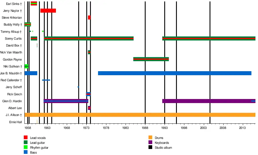 - Sonny Curtis – guitar (1958–1960, 1962–1985, 1994–2016); lead vocals (1962–1985, 1994–2016)