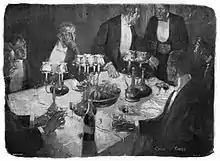 In the house, Raffles is too occupied in conversation for Bunny to warn him. At dinner, Raffles and the four men, including a Wild West novelist and a barrister who has sentenced criminals to death, amiably discuss convicted murderers and burglars. Eventually, Lord Thornaby mentions their belief that the same thief committed the burglary on Bond Street and the robbery of Lady Melrose's necklace. Raffles glibly replies that he has connections to the victims of both, and is impressed by the unknown criminal. The group jokes that the criminal might be in the house, and Lord Thornaby, anxious, sends his butler to check the house. The butler returns, and stutters that the bedroom door and dressing-room door are, disturbingly, locked from inside.