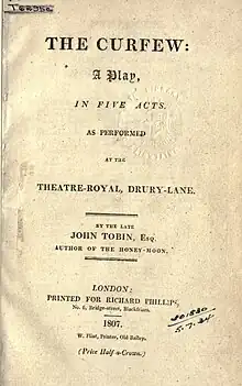 The Curfew is a historical tragedy by the British writer John Tobin[1] which was first published in 1807, three years after the author's death. It was staged by Richard Brinsley Sheridan at the Theatre Royal, Drury Lane in London premiering on 19 February 1807. The cast included William Barrymore as Hugh de Tracy, John Bannister as Robert, Henry Siddons as Bertrand, William Penley as Walter, Robert William Elliston as Fitzharding, Edmund John Eyre as Philip, Jane Powell as Matilda and Maria Duncan as Florence. It appeared at the Crow Street Theatre in Dublin on 1 April the same year.[2] It is set during the Norman era.[3]