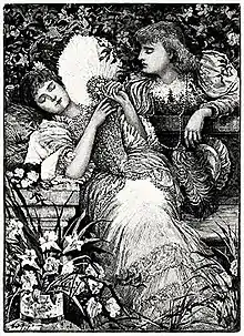 The poem compares the act of poetry with dreaming and says that the two are the same. The dream is able to stimulate the memory of the sleeping woman. Tennyson's earlier works discuss journeys through memory, including "Sense and Conscience", "The Merman", "The Mermaid", and "Recollections of the Arabian Nights".[4] Out of all of Tennyson's poems, The Day-Dream is one of the few that lack a use of irony. The poem relies on a similar theme as Tennyson's "The Lotos-Eaters" in that it talks about a living death state. However, The Day-Dream emphasizes the pleasure in being able to return to a sleep state and avoid reality.[6] However, the poem is similar to other Tennyson poems in that it relies on a frame for the story in a manner similar to "Lady Godive", Morte D'Arthur and The Princess.[7] The character Flora is similar to many of Tennyson's females that resist their fate by desiring death, including the Idyl ladies Rose of The Gardener's Daughter, Ida of The Princess, and Mariana of Mariana.[8]