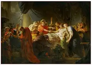 From the time of Poussin, the painting became famous in artistic circles and the painting was copied and commented on many times. However, it was not until the middle of the 18th century that the theme of Germanicus' death was taken up in the painting, but each time inspired by Poussin. He is thus represented by Piat Sauvage in 1774 and by Heinrich Friedrich Füger in 1789.[8] If the subject is not taken up much by the artists, many are those who insert in their works allusions to Poussin's painting from this period. This is the case of Jean-Baptiste Greuze in his Septimius Severus and Caracalla in 1769 or, in a more subtle way, of Jacques-Louis David's Oath of the Horatii in 1785 who declares about him: "If it is to Corneille that I owe my subject, it is to Poussin that I owe my painting ”. François Marius Granet in his Death of Poussin (Granet Museum), assimilates the painter to the Roman general. Finally, he still inspired Eugène Delacroix in The Last Words of the Emperor Marcus Aurelius in 1844 (Musée des beaux-arts de Lyon).[9]
