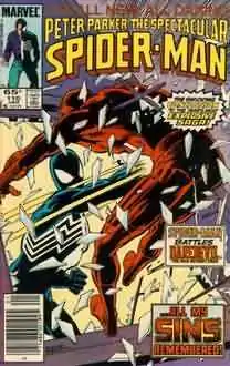 ![]() Cover of Peter Parker, the Spectacular Spider-Man vol. 110, Jan 1986 Featuring Spider-Man fighting Daredevil, art by Rich Buckler | |