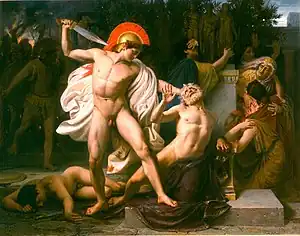 The Death of Priam is an 1861 oil on canvas painting by Léon Perrault. He entered it for the Prix de Rome but lost to Lefebvre's treatment of the same subject - both works depict Neoptolemus' murder of Priam as described in Virgil's Aeneid II, lines 509 to 516. Perrault's work is now in the École nationale supérieure des beaux-arts in Paris with inventory number MU 11709.[1][2]