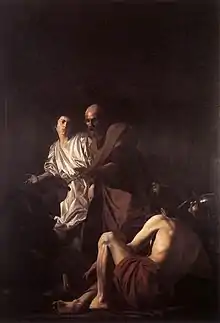 In October 1609, Caravaggio was attacked by assailants at the Osteria del Cerriglio tavern in Naples, led by Giovanni Rodomonte Roero, the Conte della Vezza. It seems he never fully recovered from the attack and this is evidenced by broad brushwork and an unfocused quality to the work.[2] The style of the picture is similar to the Martyrdom of Saint Ursula (Banca di Napoli), with which it must be more or less contemporary.[1] Caravaggio crops the figures closely and smothers large areas in shadow in order to avoid any awkward depictions of human physicality.[2] His paintings also represented a psychological intensity which was common in his later work.[9] A similar helmet was used by Battistello Caracciolo in his Liberation of Saint Peter (1615) in the Pio Monte della Misericordia, Naples.[1]