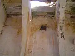 The building has a simple and modest vernacular architecture,[11] with slit windows, that function as ventilators, and waterspouts. It has no inscriptions or symbols to shed further information about its use apart from Roman numerals that were inscribed when it was converted to a farmhouse. These are found on the walls and woods, and record the sale of different types of vegetables by farmers.[5] The features of the building are examples of Maltese traditional architecture that include roofs built with limestone slabs and animal feeding mangers. Despite the conversion to a farmhouse, the building clearly does not look like it was originally meant to be one, as it is not a traditional Maltese farmhouse.[5] This and the position of the mangers prove that the building was built for horses. These characteristics may suggest that the building may have been a cow farm. The high roof of one of the buildings still prove that it is unlikely it was originally a cow farm, but it may be speculative to say that at one point it had been so.[5][6][8]