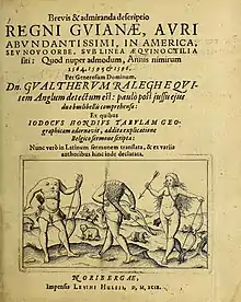 - ↑ Raleigh, Walter (1596). The Discouerie of the Large, Rich, and Bevvtiful Empyre of Guiana: With a Relation of the Great and Golden Citie of Manoa (which the Spanyards Call El Dorado) and the Prouinces of Emeria, Arromaia, Amapaia, and Other Countries, with Their Riuers, Adioyning : Performed in the Yeare 1595. London: Robert Robinson – via Google Books.
