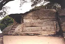 The growing city of Sydney put great pressure on the Domain. A major encroachment was the construction of the Garden Palace for the Sydney International Exhibition (1879). Only its gates and some statues remain after a fire in 1882. The site of the Garden Palace was later absorbed into the Royal Botanic Gardens. In 1883 2 hectares (5 acres) of Outer Domain was incorporated into the Lower Garden, completing the ring of waterfront along Farm Cove. In the 1880s the Tarpeian Rock is a prominent, dramatic and significant sandstone cliff landscape feature on the north west boundary of The Domain facing Bennelong Point and the Sydney Opera House, cut for the extension of Macquarie Street. It derives its name from the famous rock on the Capitoline Hill in Rome from where prisoners were hurled to their deaths in ancient times. A stairway gives access from close to the Sydney Opera House to the top of the rock and The Domain. An early carving in the sandstone cliff is located about 3 metres (9.8 ft) above the fifth step from the base of the cliff. The carving reads "The Tarpeian Way". It possibly dates from the time of construction in the 1880s.[2][11]