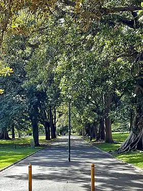 The southern part of The Domain was not set aside as a public park until 1810.[2][3] As soon as he arrived in 1810, Bligh's successor Governor Macquarie built stone walls around the Government House garden and the Government Domain, separating them from Hyde Park. The traditional foundation date of the Botanic Gardens is taken as the date of completion of Mrs Macquarie's Road, on 13 June 1816. By 1817 the Domain was completely enclosed and the road system completed including several gates to regulate horse-drawn traffic. The Domain itself was cleared of trees and opened as a public area in the 1830s. Eventually, the Inner Domain, the area closest to Government House, was entirely consumed by the Government Gardens while the area now known as the Domain was then the Outer Domain. Macquarie improved the garden, building a protecting wall on the harbour side and constructing and landscaping a road running around The Domain, north of the Government gardens/nursery at some distance from the shore, and bridging over Farm Cove Creek to Mrs Macquarie's Chair on Mrs Macquarie's Point in the east. Swamp mahogany (Eucalyptus robusta) trees were planted to line this road, perhaps the earliest "Street trees" planted in the colony. Another 1813-1816 planting was of the black booyong (Heritiera actinophylla) west of the palm grove, which remains. On the completion of these works the area was officially inaugurated as a Botanic Garden in 1816. In 1821 the Government House stables (now the Conservatorium of Music), designed by Government Architect Francis Greenway, was completed in The Domain's north near Macquarie and Bridge Streets.[2]