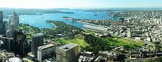 The Domain is a heritage-listed 34-hectare (84-acre) area of open space located on the eastern fringe of the Sydney central business district (central Sydney), in the City of Sydney local government area of New South Wales, Australia.[1] Separating the central business district from Woolloomooloo, The Domain adjoins the Royal Botanic Gardens and is managed by the Royal Botanic Gardens Trust, a division of the NSW Office of Environment and Heritage, an agency of the Government of New South Wales. The Domain is used as a venue for outdoor concerts, open-air events, large political gatherings and rallies, as well as being used daily by the people of Sydney for exercise and relaxation. Along with the Royal Botanic Gardens, The Domain was added to the New South Wales State Heritage Register on 2 April 1999.[2]