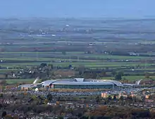 The Doughnut is divided into three separate four-storey structures, identical in design, and connected at the top and bottom.[5][16] With a total floor area of 140,000 square metres (1,500,000 square feet), the building contains two circular blocks, internally divided by a 'street' covered in glass.[5][16] Construction materials were primarily steel, aluminium, and stone,[3] particularly granite and local limestone from the Cotswolds; designers incorporated recycled materials in the steelwork and the construction of desks.[5] The design of the Doughnut was subsequently nominated for an award to "highlight improvements to the built and landscaped environment" given by Cheltenham's Civic Society.[17]