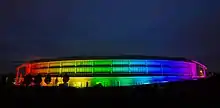 In 2015, the Doughnut was illuminated with yellow light to mark GCHQ staff's support for The Guide Dogs for the Blind Association,[28] and by a rainbow spectrum of colours to mark the International Day Against Homophobia, Transphobia and Biphobia.[29]