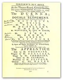 The Duenna was first performed on 21 November 1775 at Covent Garden Theatre, London. The play catered to the reputation of the Covent Garden Theatre as the home of low comedy, the comedy of the jape, the leer and the pratfall.[9] However, Covent Garden was also the traditional home of opera and musical entertainment, being built with the original profits from Gay's The Beggar's Opera (Covent Garden Theatre is now called the Royal Opera House). The opera was an immediate hit, with 75 performances in its first season and a total of 254 performances at Covent Garden alone in the 25 years between its opening and the end of the eighteenth century.[6]