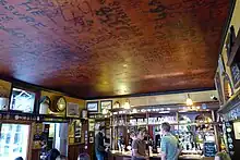During the Second World War, Allied airmen, who drank and socialised at The Eagle, used wax candles, petrol lighters and lipstick to write their names, squadron numbers and other doodles onto the ceiling of the rear bar. The tradition is believed to have been started by RAF Flight Sergeant P. E. Turner, who climbed up on the table one night to burn his squadron number on the ceiling.[5] The graffiti, in what is now known as the "RAF Bar",[2] was uncovered, deciphered and preserved by former RAF Chief Technician James Chainey during the early 1990s.[3]