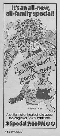 The Easter Bunny Is Comin' to Town is a 1977 musical Easter television special produced by Rankin/Bass Productions, using their "Animagic" stop motion animation. It reunites the writer Romeo Muller, designer Paul Coker Jr., and narrator Fred Astaire from Santa Claus Is Comin' to Town, and stars the voices of Skip Hinnant, Bob McFadden, Meg Sargent, James Spies, and Allen Swift. The special originally premiered on ABC in the United States on April 6, 1977.[1][2]