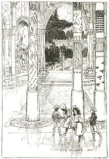 The enchanted castle of the title is a country estate in the West Country seen through the eyes of three children, Jerry, Jimmy, and Kathy, who discover it while exploring during the school holidays. The lake, groves and marble statues, with white towers and turrets in the distance, make a fairy-tale setting, and then in the middle of the maze in the rose garden, they find a sleeping fairy-tale princess.