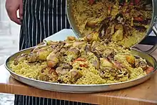 The menu is primarily meat-based, although some vegetarian and vegan dishes are available.[17] Tasting menus are available for different courses,[18] such as a soup course of Jerusalem artichoke, lentil, and tomato and mint soups[3] and a meze course of pickled green almonds, marinated black olives, and hummus and eggplant salad.[8] Basson makes a ceremony with diner participation out of his signature dish, maqluba, a regional dish prepared by browning chicken in the bottom of a heavy pot, layering browned vegetables and rice into the pot, slow-cooking the dish without stirring it, and finally flipping it out upside down to produce a cake-shaped mound with layers of rice and vegetables topped by the chicken.[1][19] Other house specialties are figs stuffed with chicken and served in a sweet and sour tamarind sauce, and neck of lamb baked overnight in a clay pot covered with pita bread.[17][20][21]