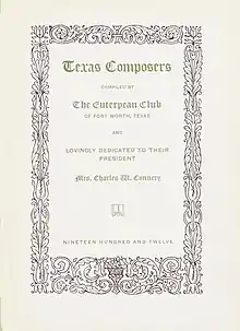 In 1900, the Euterpean Club joined Fort Worth's City Federation;[8] the following year it became a delegate to the Texas Federation of Women's Clubs. In 1910, the co-ed Juvenile Euterpean Club was established, the first music club for children in Texas.[1] The Euterpean Club's long-running contest for original musical compositions resulted in a 1912 book called Texas Composers.[1][9] During World War I, the club's Camp Bowie War Service Committee served lunches at the army camp on Fort Worth's west side, organized weekly concerts at the local YWCA, and performed weekly organ concerts for soldiers at the First Christian Church.