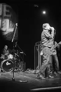 First associated with the late 1970s punk movement, the Fall's music underwent numerous stylistic changes, often concurrently with changes in the group's lineup. Nonetheless, their music has generally been characterised by an abrasive, repetitive guitar-driven sound, tense bass and drum rhythms, and Smith's caustic lyrics,[4] described by critic Simon Reynolds as "a kind of Northern English magic realism that mixed industrial grime with the unearthly and uncanny," voiced through a "one-note delivery somewhere between amphetamine-spiked rant and alcohol-addled yarn."[5] While the Fall never achieved widespread success beyond minor hit singles in the late 1980s and early 1990s, they have maintained a strong cult following.