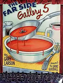 The Far Side Gallery 5 is the fifth and final anthology of Gary Larson's The Far Side comic strips. Cartoons from previous collections Cows of Our Planet, The Chickens are Restless, and The Curse of Madame "C" are featured, all of which were printed from 1992 to 1994. The foreword was written by Jane Goodall, who was commonly satirized in Larson's comics. The cover shows several flies in a movie theater watching a movie, in which a fly was calling for help because it was in a spoonful of tomato soup.
