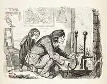 In one of the fable's alternative versions, the farmer takes the snake home to revive it and is bitten there. Eustache Deschamps told it this way in a moral ballade dating from the end of the 14th century in which the repeated refrain is "Evil for good is often the return."[6] William Caxton amplified this version by having the snake threaten the farmer's wife and then strangle the farmer when he tried to intervene.[7] In still another variation, the farmer kills the snake with an axe when it threatens his wife and children. La Fontaine tells it thus as "Le villageois et le serpent" (VI.13).[8]