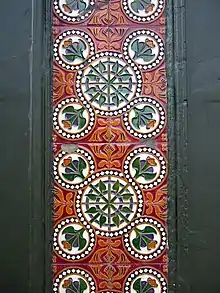 English Heritage note that the building is of yellow stock brick with some stucco. They also comment on the "twin entrances set between tall windows and flanked by three pilasters enriched with glazed tiles, as well as paterae over pilasters at frieze level".[1]