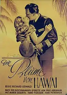 The Flower of Hawaii (German: Die Blume von Hawaii) is a 1933 German musical film directed by Richard Oswald and starring Mártha Eggerth and Iván Petrovich.[1] The film was shot at the Tempelhof Studios in Berlin with sets designed by the art director Franz Schroedter. Location shooting took place on the French Riviera. It is an adaptation of the operetta The Flower of Hawaii by Paul Abraham. The operetta was later adapted again for a 1953 film. It is based on the life of the last Queen of Hawaii, Liliuokalani.
